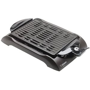 Ideal for grilling steaks, chicken, fish, burgers, and vegetables indoors, this 1300-watt countertop appliance has a big, family-size grill surface of 12-1/2 by 9-1/4 inches coated with nonstick for low-fat cooking and easy cleaning. A variable heat control provides precise cooking temperatures, and the grill's handles and stylish, dark-gray plastic base stay cool during operation for safety. Another safety feature prevents the heat control, which provides power to the appliance, from being inserted unless the metal drip tray and cooking grid are in place and prevents the grid from being removed during operation. The appliance disassembles easily for cleaning, and the drip tray is dishwasher-safe. Overall, the unit measures 20-3/4 inches wide, 6-1/8 inches high, and 14 inches deep. --Fred Brack